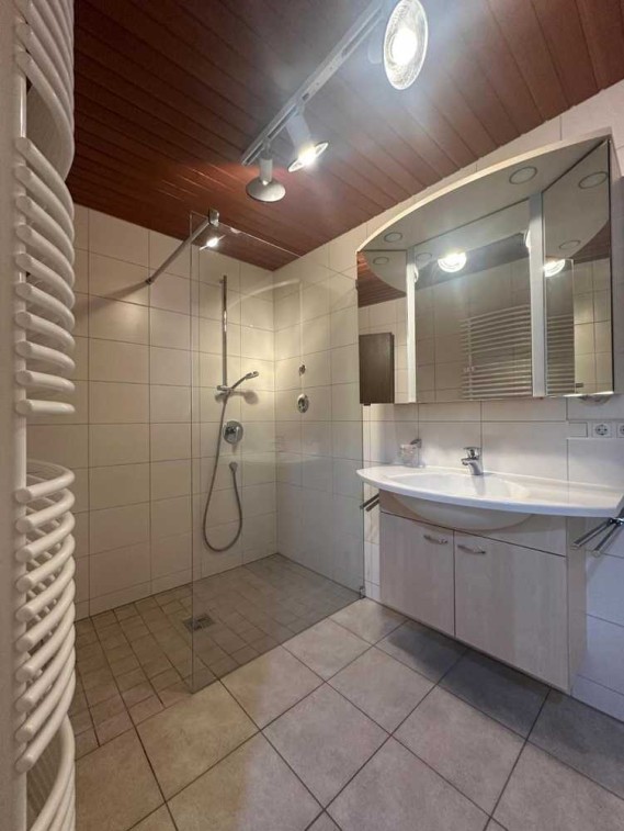 Das Badezimmer ist renoviert worden, helle Fliesen und eine bodengleiche Dusche wurden eingebaut. Das holt einen ab, hier hat man einen Wohlfühlraum gestaltet. Der Handtuchheizkörper sorgt für schnell trockene Badetücher und für zusätzliche Wärme.