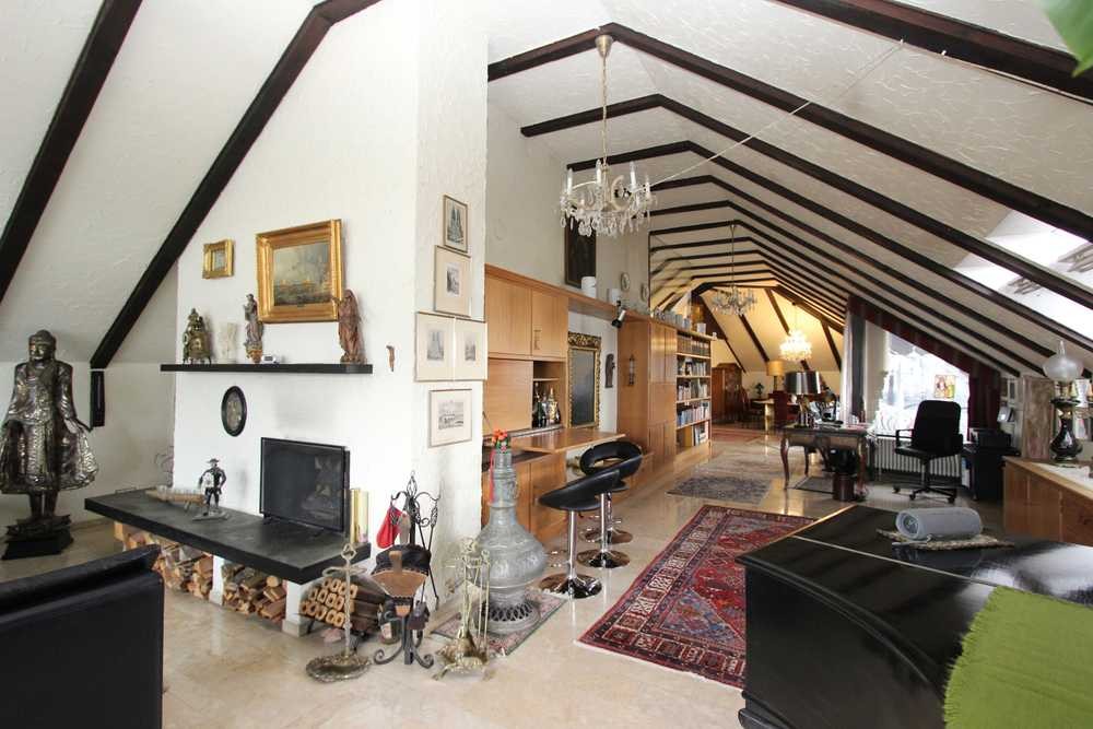 öffnen die Perspektive in drei verschiedene Himmelsrichtungen. Die große Fensterfront Richtung Westen schafft eine lichte Atmosphäre. Gleichzeitig sorgen die durchgehend sichtbaren Holzträger des Dachs für ein behagliches Wohngefühl. Im Eingangsbereich, Wohn- und Essbereich ist der Boden durchgehend mit Marmorboden ausgestattet. Aufgrund der zahlreichen Dachfenster, der Terrassen und des Wintergartens ist die Wohnung insgesamt wunderbar hell. Im gesamten Wohn- und Essbereich verfügt