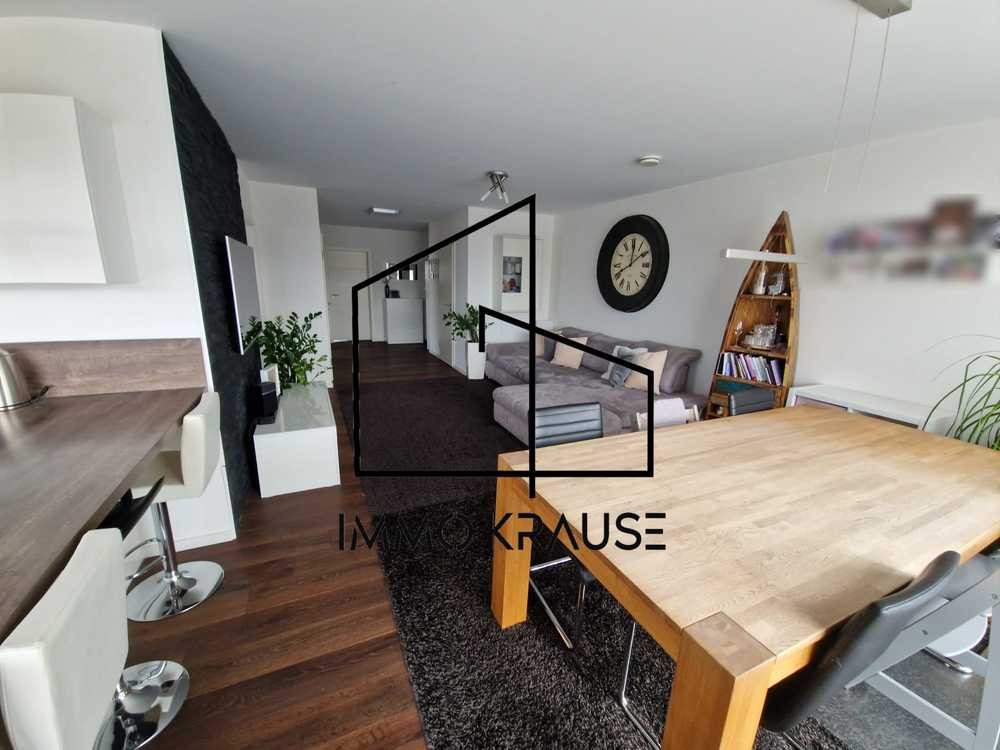 Der offen gestaltete Wohn- und Essbereich ist das Herzstück der Wohnung: Dank bodentiefer Fenster genießen Sie hier eine lichtdurchflutete Atmosphäre. Der edle Echtholz-Parkettboden in Landhausdielenoptik verleiht dem Raum eine besondere Wohnqualität. Die moderne Einbauküche mit Theke fügt sich stilvoll in den Raum ein – ideal für gesellige Kochabende.