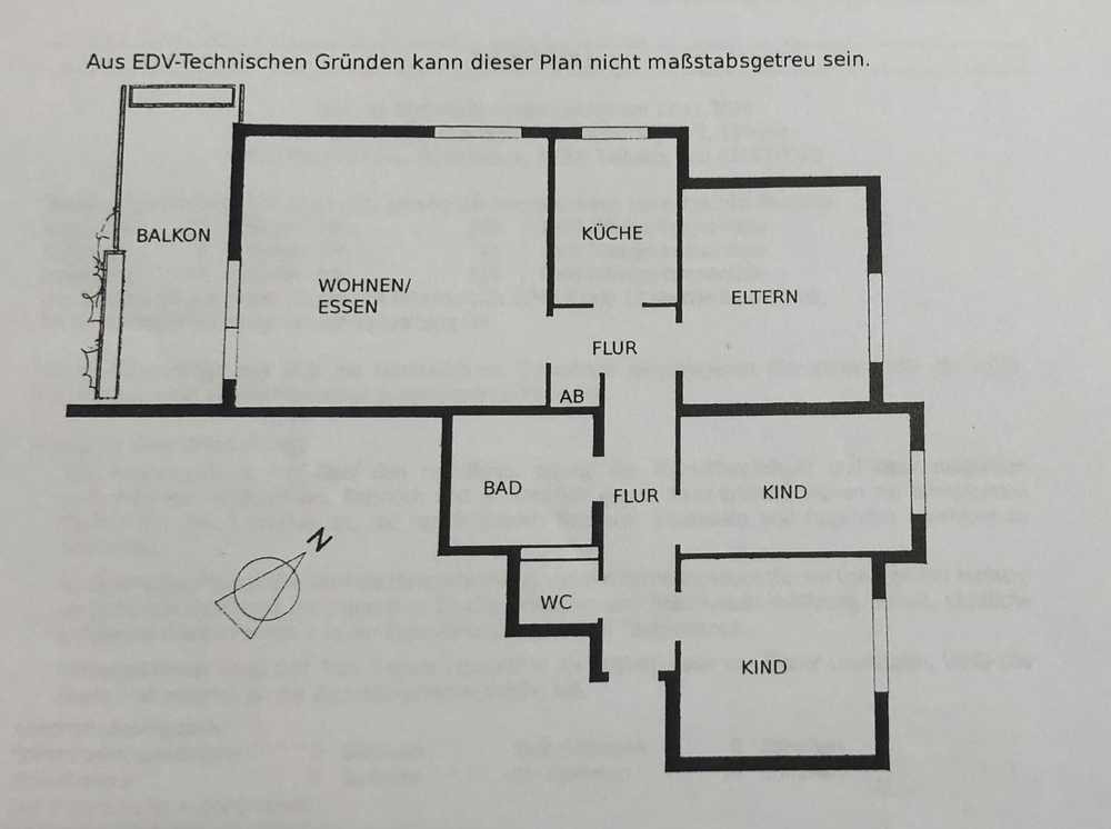Flur, WC, Bad, drei Schlafzimmer, Küche, Wohn-/Esszimmer, Balkon