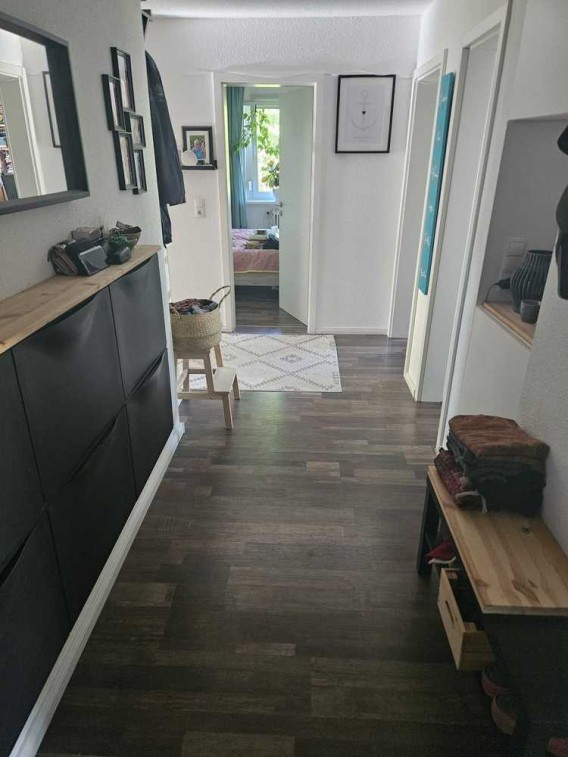 Durch die Wohnungstür gelangt man in einen großzügigen Flur von dem aus alle Zimmer abgehen. Die Küche kann auf Wunsch übernommen werden. Vom Wohnzimmer aus gelangt man auf den Balkon. Das große Hauptzimmer nutzen wir aktuell als Büro und Hobbyzimmer, das kleinere Zimmer als Schlafzimmer. Das Tageslichtbad verfügt über eine Badewanne. Zur Wohnung gehört ein großer Kellerraum, außerdem kann im gemeinsamen Wäscheraum die Wäsche getrocknet werden und es gibt einen Waschraum, in dem eine durch die Hausgemeinschaft genutzte Waschmaschine steht.
