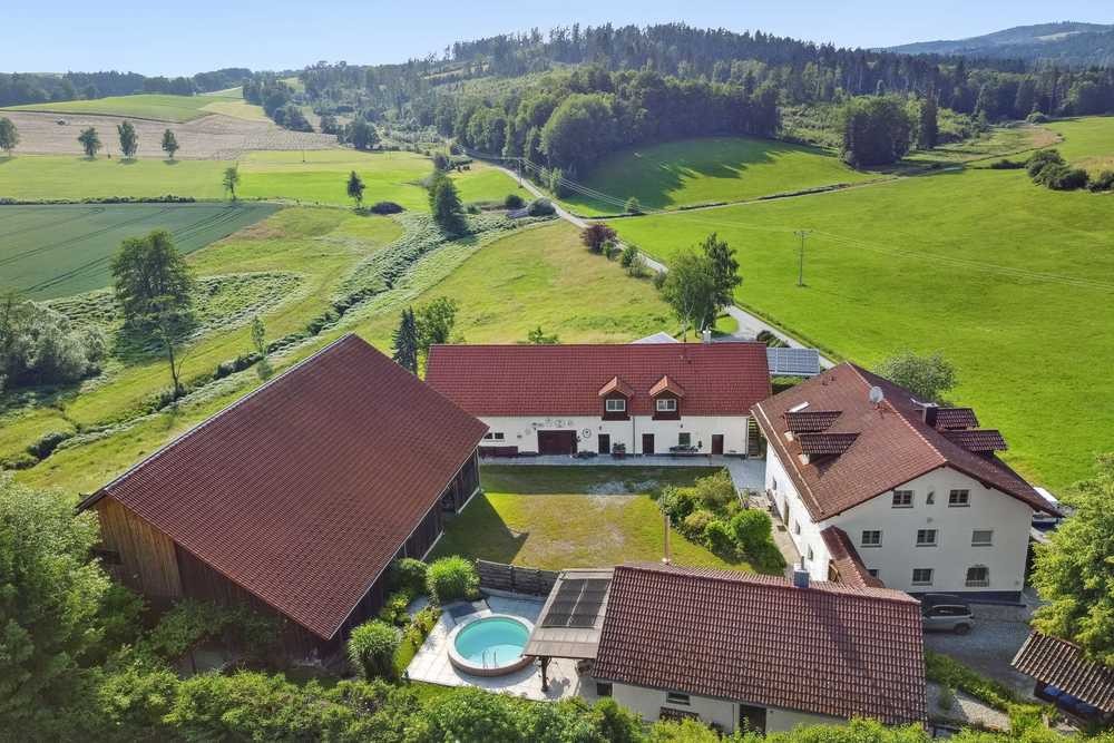 Das ehemalige teilunterkellerte, zweigeschossige Bauernhaus, vermutlich um 1865 erbaut, wurde in den 1990-Jahren im Zuge einer umfassenden Renovierung und Modernisierung in ein 5-Familienhaus mit ca. 250 m² Wohnfläche zzgl. Nebennutzflächen gewandelt. 4 Wohnungen darin sind vermietet, eine ist eigengenutzt. Im rechten Winkel dazu befindet sich das ehemalige zweigeschossige Austragshaus mit knapp 100 m² Wohnfläche zzgl. Keller- und Abstellflächen, das renoviert wurde und seit 2012 vermietet ist. Das ebenfalls zweigeschossige massive Nebengebäude mit einer ebenerdigen Grundfläche von ca. 250 m² (10 m x 25 m) wird mit einem kleinen Apartment mit Küche und Bad im Erdgeschoss sowie einer 4-Zimmer-Wohnung mit Küche und Bad im Obergeschoss wohnlich und ansonsten für Lager-, Nutz- und Technikfläche genutzt. Die Wohn- und Nutzgebäude, außer der Scheune, sind an die öffentliche Wasserversorgung und Abwasserentsorgung angeschlossen. Die Beheizung erfolgt jeweils über Öl-Zentralheizung. Die zweigeschossige sehr gut erhaltene Scheune (ca. 24 m x 17 m), deren Dach in 2006 erneuert wurde, bietet allerhand Verwendungsmöglichkeiten, insbesondere auch für den Einbau von Pferdeboxen. Im Jahr 2006 wurde eine Carportanlage mit insgesamt 7 Stellplätzen errichtet, jeweils ausgerüstet mit Ladestationen für E-Autos.