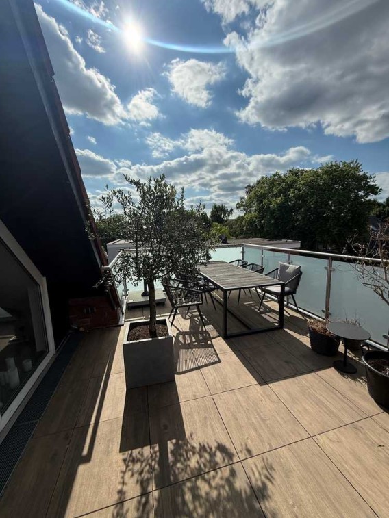 Über den offenen Wohn-/Essbereich ist die Hauptterrasse mit rund 42 Gesamtfläche erreichbar. Große Fensterflächen lassen viel Tageslicht einströmen. Die zweite Terrasse mit ca. 11 qm ist vom Arbeitszimmer sowie von großen Duschbad aus zugänglich.