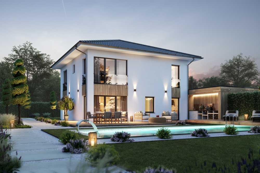 Die moderne Stadtvilla in zwei Ebenen verbindet klare Linien und helle Akzente mit natürlichen Holzelementen – ein echtes Statement für stilbewusstes Wohnen. Großzügige Panorama-Fenster fluten die Räume mit Licht und schaffen ein offenes, freundliches Ambiente, das zum Wohlfühlen und Entspannen einlädt.