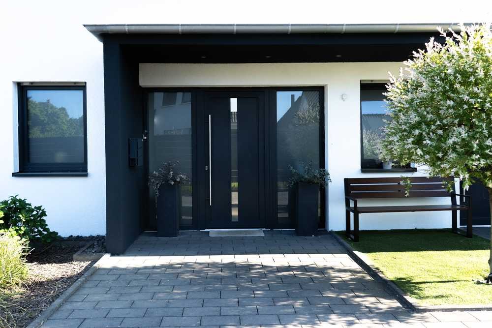 Im Erdgeschoss stehen Ihnen rund 128 m² zur Verfügung, verteilt auf drei Zimmer, Küche, Bad, Gäste-WC sowie einen praktischen Hauswirtschaftsraum. Der offen gestaltete Wohn- und Essbereich mit über 40 m² Wohnfläche bietet dank großer Fensterflächen viel Tageslicht und ein luftiges Raumgefühl. Besonders hervorzuheben ist das luxuriös ausgestattete Badezimmer mit bodentiefer, gemauerter Dusche, freistehender Badewanne, Doppelwaschtisch und separatem WC – ein echtes Wellness-Highlight im Alltag. Die angrenzende ca. 30 m² große Sonnenterrasse eröffnet einen direkten Blick in den liebevoll angelegten Garten, der durch stilvolle Einfriedung ausreichend Privatsphäre gewährt.