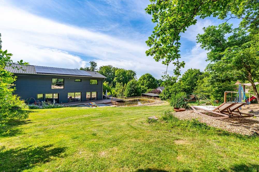 Die architektonische Gestaltung des Hauses sowie die außergewöhnlich hochwertige Ausstattung vermitteln in jeder Ecke den Anspruch an Qualität und Nachhaltigkeit: So sorgt eine Fassadendämmung mit Holzfaserdämmplatten in Verbindung mit traditionellem Lehmputz für ein herausragendes Raumklima und gleichzeitig für höchste Energieeffizienz. Unterstützt wird das energetische Konzept durch eine leistungsstarke Photovoltaikanlage mit 29,2 kWp, eine Nibe-Erdwärmepumpe mit passiver Kühlung sowie eine kontrollierte Wohnraumlüftung der Firma Maico.