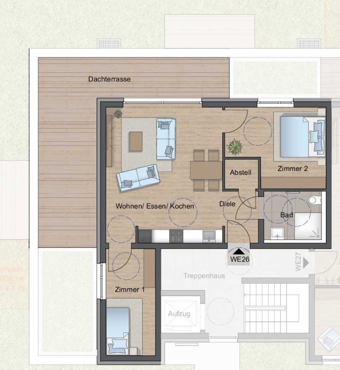 Dreizimmerwohnung mit 32 Qm. großer Dachterrasse und Personenaufzug im 2. OG, QNG förderfähig!