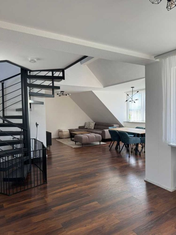Beim Betreten der Wohnung erwartet Sie ein großzügiger Wohnbereich, der viel Tageslicht durch die bodentiefen Fenster einfängt. Die offene Küche ist modern und funktional gestaltet und lädt zum gemeinsamen Kochen ein. Ein Highlight ist die Wendeltreppe, die in den oberen Bereich führt, wo sich die Schlafzimmer und das Badezimmer befinden. Die großen Fenster in den Schlafzimmern sorgen für eine luftige Atmosphäre.
