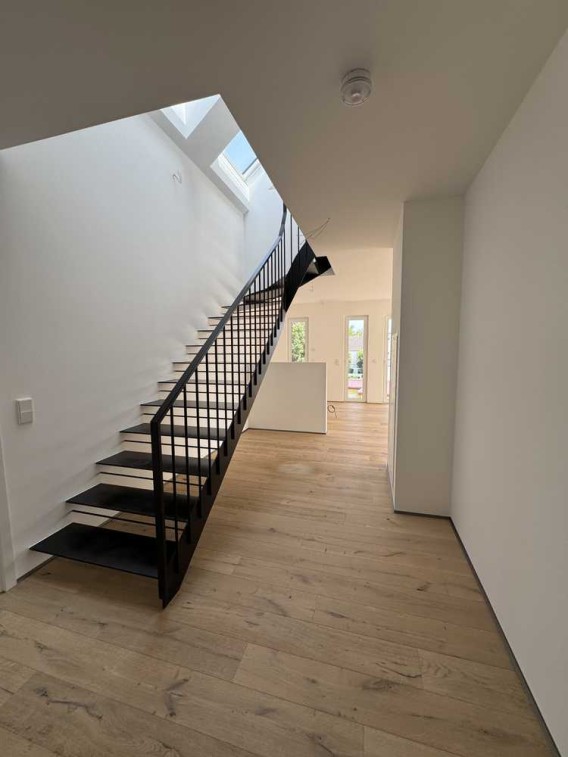 -Über die elegante schwarze Stahldesigntreppe, die durch zwei Galeriedachfenster mit Tageslicht versorgt wird, gelangen Sie in die zweite Etage.