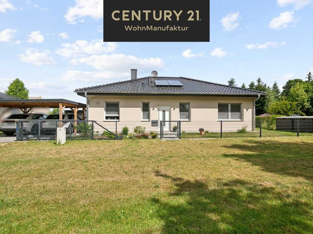 Achtung, hier kommt Ihr neuer Lieblingsplatz! Dieser neuwertige nachhaltige Bungalow, aus dem Jahr 2021, bietet auf ca. 118 m² alles, was das Herz begehrt. Genießen Sie den lichtdurchfluteten Wohnbereich mit direktem Zugang zur Terrasse und einem Kaminofen, der Sie an kalten Tagen wohlig wärmt, was ansonsten die Fußbodenheizung übernimmt. Für kulinarische Freuden erwartet Sie eine großzügige Wohnküche mit moderner Einbauküche und Essmöglichkeit für die ganze Familie, was Hobbyköche zum Strahlen bringt. Mit insgesamt 5 Zimmern, inkl. dem ausgebauten Dachstuhl, finden auch die Kids oder Teenies ihr eigenes Reich, in dem sie sich austoben und ihre Privatsphäre genießen können. Das Wannen-/Duschbad sowie ein zusätzliches Gäste-WC sorgen für die nötige Entspannung und Komfort. Ein großer eingezäunter Garten, von ca. 1.000 m², bietet viel Raum für Groß und Klein zum chillen, feiern oder toben und auch für die Vierbeiner bleibt ausreichend Bewegungsfreiheit. Praktischerweise gibt es auch ein großzügiges Doppelcarport für die fahrbaren Untersätze und mit nur 150 Metern zur nächsten öffentlichen Verkehrsanbindung sind Sie - auch ohne PKW - bestens angebunden. Lassen Sie sich diese Gelegenheit nicht entgehen und machen Sie Ihr Wohntraum wahr!
