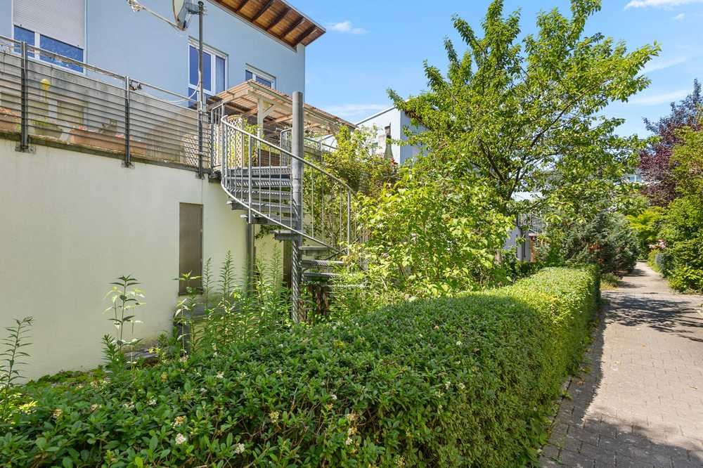 Der Balkon bzw. die Terrasse ist überdacht und mit einer Wendeltreppe an den Garten angebunden.