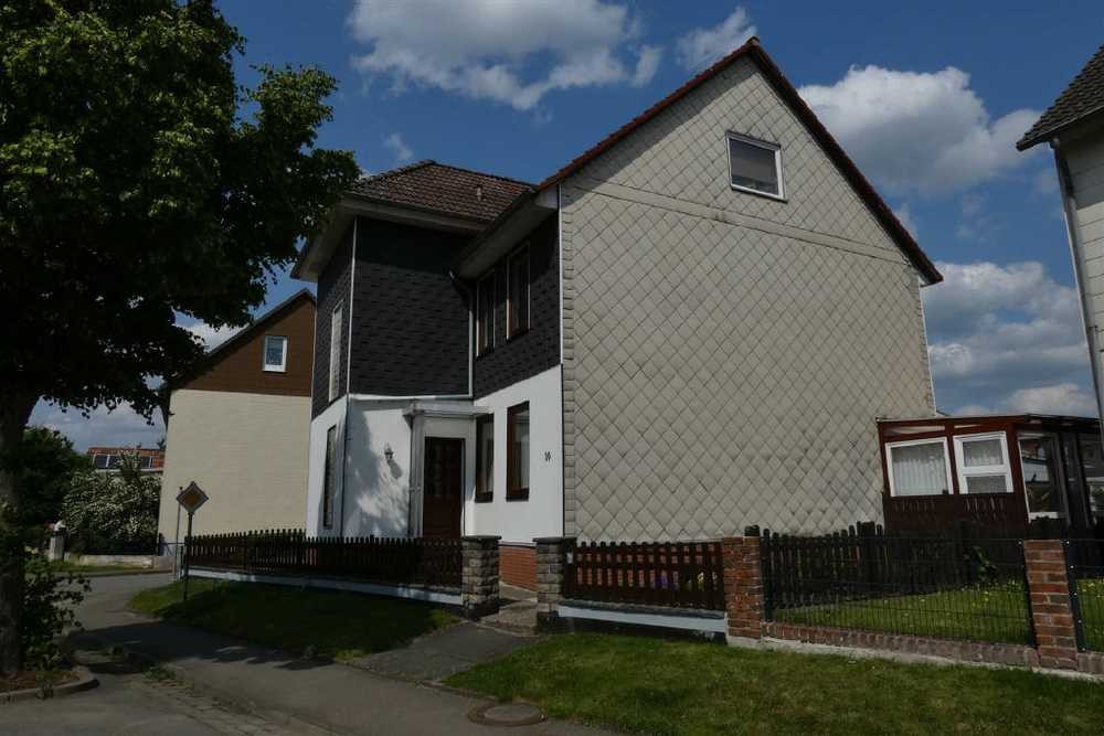 Das Zweifamilienhaus in Goslar OT Wiedelah befindet sich auf einem 383 m² großen Eckgrundstück mitten im Ort.