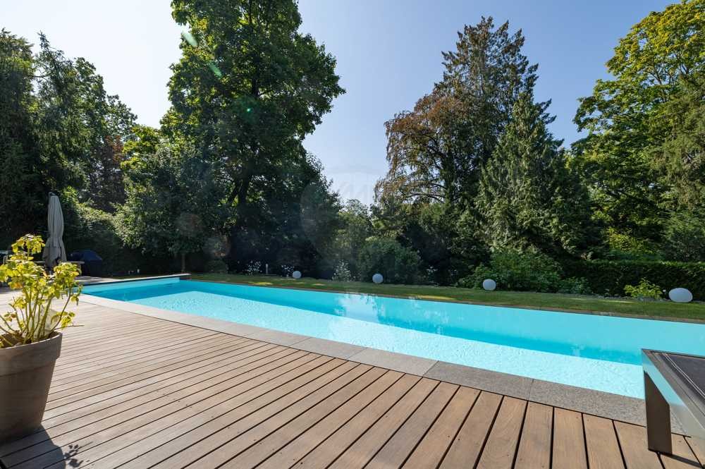 Der helle Eingangsbereich führt direkt in das Wohnzimmer mit Kamin sowie in die großzügige, moderne Poggenpohl-Küche mit Siemens- und Gaggenau-Geräten. Besonders beeindruckend ist das lichtdurchflutete Esszimmer mit einer Deckenhöhe von über 5 Metern. Bodentiefe Fenster öffnen den Raum zur imposanten Süd-Terrasse mit einem geschmackvoll angelegten, eingewachsenen Garten und einem beheizten Außenpool.
