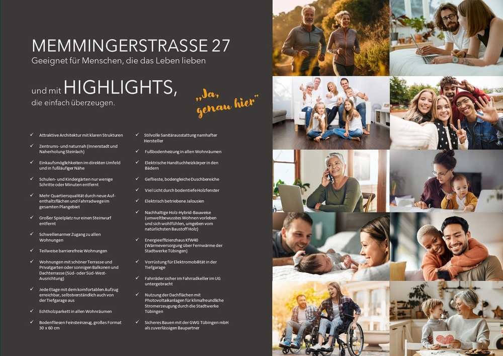 Unsere Immobilie bietet Ihnen 2- bis 5-Zimmer-Wohnungen mit Wohnflächen von 47 bis 118 m² und ein Raumkonzept, bei dem Komfort und Nachhaltigkeit Hand in Hand gehen. Im Erdgeschoss und ersten Obergeschoss ist eine moderne Kindertagesstätte der Stadt Tübingen beheimatet, die über einen eigenen Eingang, Aufzug und Treppenhaus verfügt.