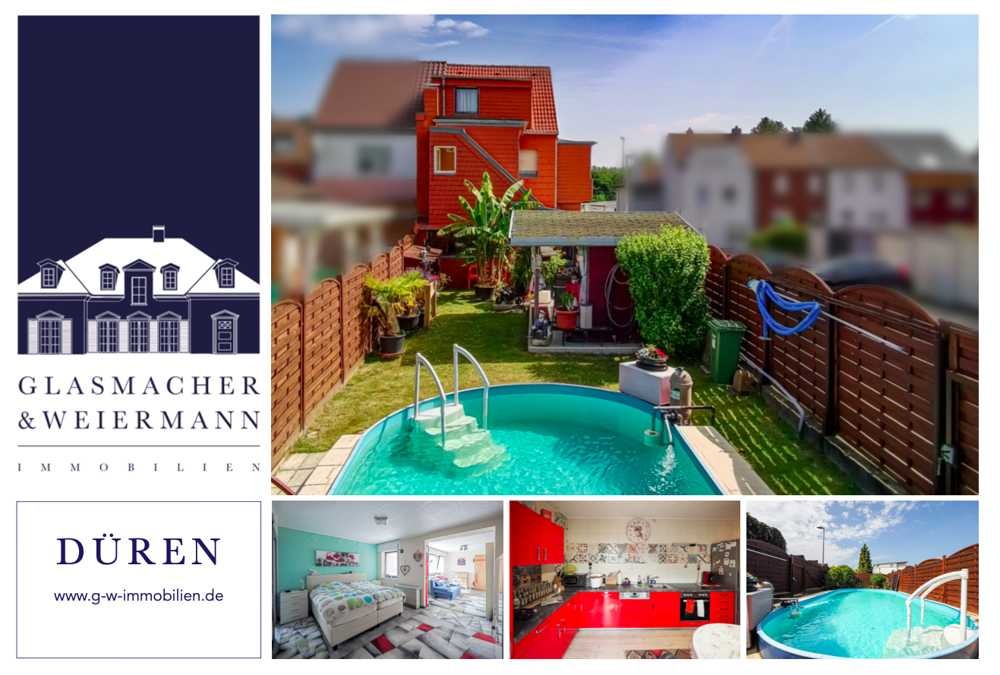 Ein besonderes Highlight ist der liebevoll angelegte, nicht einsehbare Garten mit einer großzügigen Poolanlage und einem gemütlichen Gartenhaus – ein echtes Refugium für Sommerabende, Entspannung und Familienfeste. Der Zugang zur großflächig angelegten Doppelgarage führt über die Anliegerstraße.