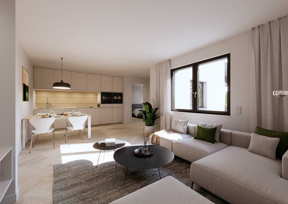 Das Frechener Stadthaus hat sich vom nordischen Stil inspirieren lassen und schafft durch helle, neutrale Töne, Fensterhöhen bis zu 2,30 m ein harmonisches wie auch stimmiges Design innerhalb der Wohnungen. Die technische Ausstattung bietet einen hohen Komfort, Sicherheit und Funktionalität.