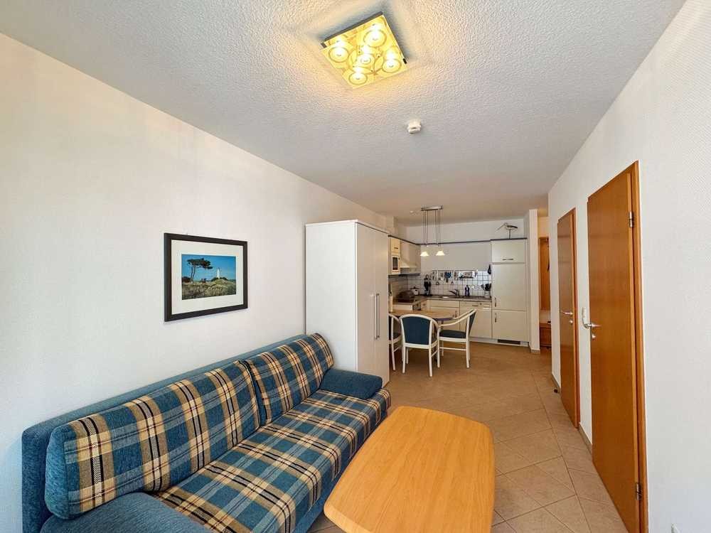 Nach dem Betreten der Wohnung öffnet sich der kompakte Eingangsbereich zu einem hellen, offen gestalteten Wohnraum mit integrierter Einbauküche – das zentrale Herzstück der Wohnung. Große Fenster lassen viel Licht herein und bieten Zugang zum großzügigen Balkon, der mit einem seitlichen Meerblick begeistert.