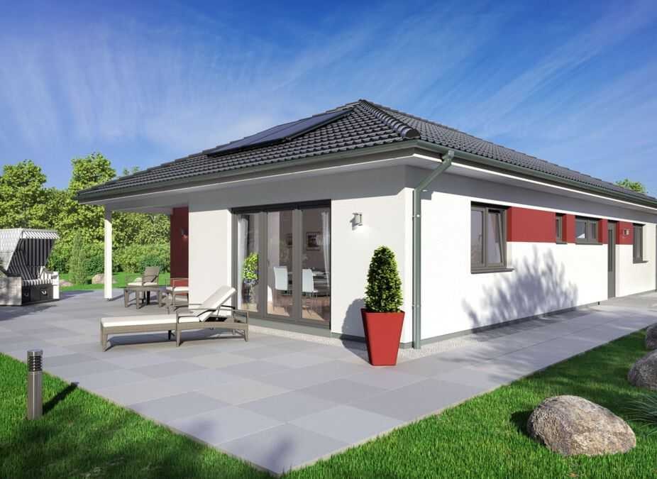 Großzügiger Wohn-und Essbereich mit offener oder geschlossener Küche. Lichtdurchflutete Fensterfronten bieten den direkten Zugang zur Terrasse und den Blick in den Garten und die Natur. Ob Schlafzimmer mit Ankleide und angrenzendem Badezimmer oder Büro und Gästezimmer. Hier ist Platz für viele Ideen und Wünsche. Ein modernes, behindertengerechtes Badezimmer auf Wunsch mit Haltegriffen und unterfahrbarem Waschtisch, sowie Bidet und Spiegel auf Augenhöhe. Das Gästezimmer kann sowohl für eine Pflegerin mit angrenzendem Duschbad genutzt werden, oder natürlich Freunde und Familie. Hier bleiben keine Wünsche offen und das Beste, es ist alles bezahlbar. Der praktische Hauswirtschaftsraum hat Platz für Waschmaschine, Trockner und die gesamte Technik. Energetisch und nachhaltig ist dieser Bungalow gebaut. Durch niedrige Heizkosten und umweltfreundliche Technik zum Beispiel einer Luft-Wasser-Wärmepumpe mit Fußbodenheizung oder auch einer Photovoltaikanlage sind Nebenkosten gut kalkulierbar und äußerst lukrativ für unsere Bauherren.