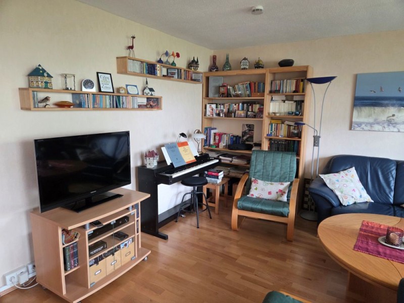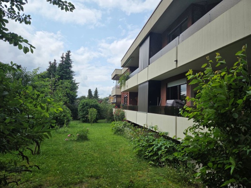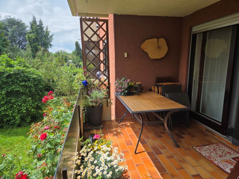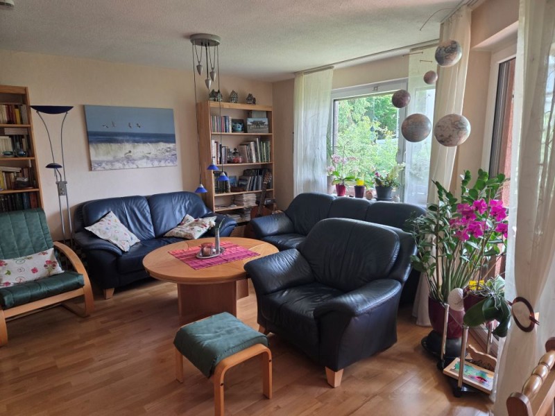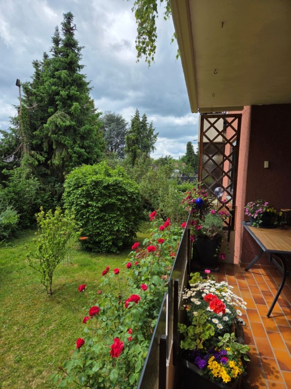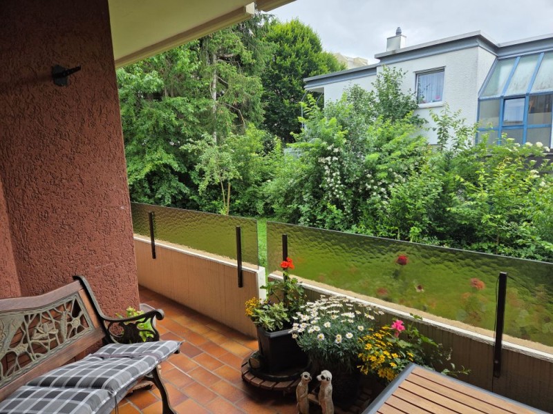 Schöne Wohnung im Hochparterre eines 6-Parteien-Hauses mit unterschiedlich großen Wohnungen; großer Garten um das Haus; sehr ruhige Lage in 2. Reihe abseits der Durchgangsstraßen, im Sommer dank Balkonüberdachung angenehm kühl, im Winter bei direkter Sonneneinstrahlung hell und warm.
