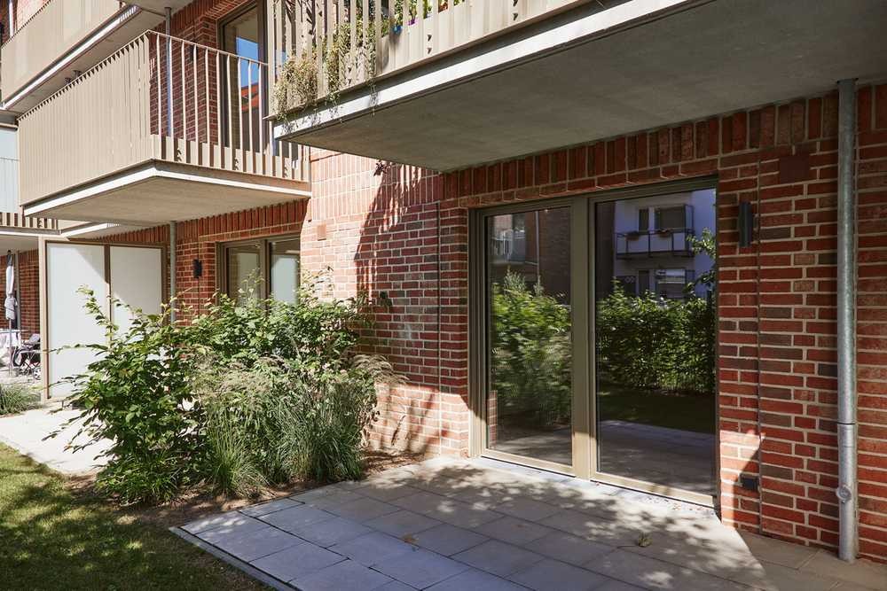 Über das elegante Vorderhaus am Stuvkamp öffnet sich der Blick in einen liebevoll gestalteten, grünen Innenhof. Zwei harmonisch proportionierte Wohnhäuser fügen sich hier in eine wohltuend ruhige Atmosphäre ein – ein geschützter Rückzugsort im Herzen von Barmbek.
