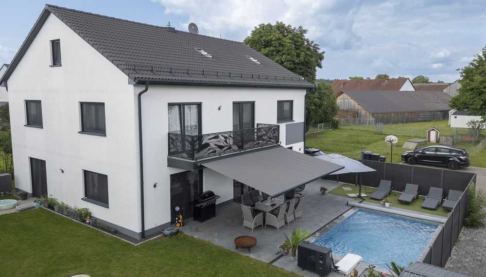 Das Grundstück ist eingezäunt und ebenfalls hochwertig angelegt. Es besitzt ein Gartenhaus für die Gartengeräte, Liegen und Auflieger. Die große Terrasse lädt zum verweilen ein. Die Markise bietet großflächigen Sonnenschutz. Ein besonderes Highlight ist der Pool. Dieser ist mit einer Wärmepumpe für die Warmwasserbereitung ausgestattet.