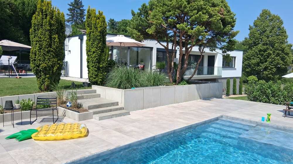 Ein absolutes Highlight ist der stilvoll integrierte Außenpool, der harmonisch in die Gartenlandschaft eingebettet ist und in den warmen Monaten für maximale Entspannung sorgt.