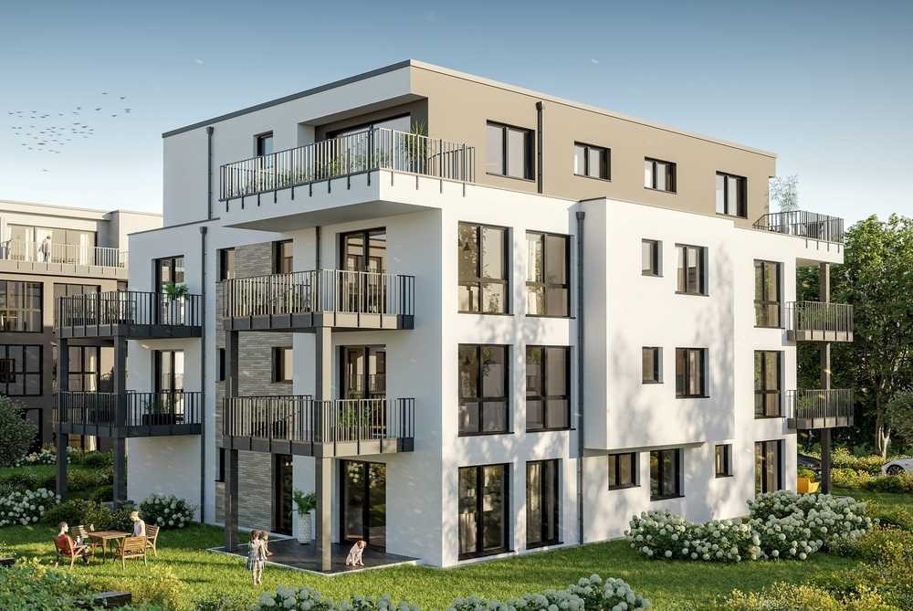 Das 3-geschossige Mehrfamilienhaus gewinnt durch die klare Gliederung der Fassade. Die Wohnungen überzeugen durch ihre gelungene Verbindung von Licht, Exklusivität und optimaler Nutzungsmöglichkeit. Die Wirkung der bodentiefen Fenster mit der feinen Unterteilung wird durch die transparenten Balkonbrüstungen unterstrichen. Farben, Formen und Materialien sind aufeinander abgestimmt. Eine besondere Atmosphäre entsteht in den Staffelgeschoss-Wohnungen.