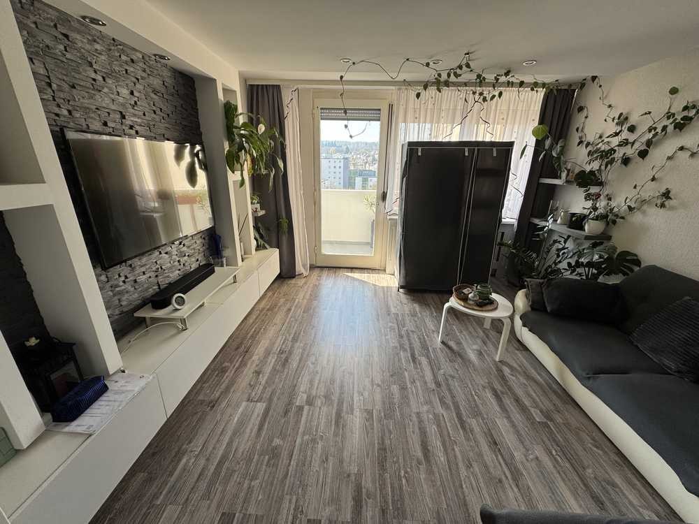 Das Herzstück der Wohnung bildet das großzügige Wohnzimmer mit angrenzendem Essbereich. Große Fensterflächen sorgen für viel Licht und ein angenehmes Wohnklima. Der moderne, graue Vinylboden verleiht dem Raum eine zeitlose Eleganz. Vom Wohnzimmer aus gelangen Sie auf den großen Balkon – ein echtes Highlight mit herrlicher Aussicht und genügend Platz für gemütliche Stunden im Freien.