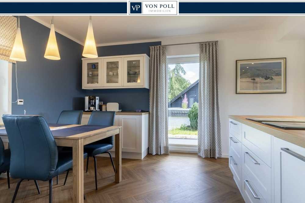 Die Küche ist ebenfalls im Landhausstil gehalten und präsentiert sich mit weißen Fronten und warmen Holzakzenten, die perfekt auf den Fußboden abgestimmt sind. Diese Kombination schafft ein zeitloses, gemütliches Ambiente, das traditionellen Charme mit moderner Funktionalität verbindet. Die hochwertige Einbauküche ist mit modernen Geräten ausgestattet und bietet optimale Voraussetzungen für kulinarische Erlebnisse.