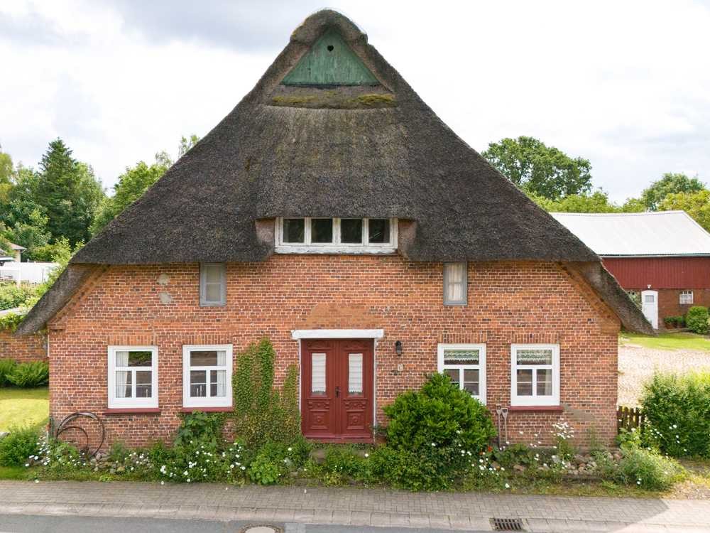 Wohnen im historischen Bauernhaus von 1850. Dieser Hof wird geprägt von altem Kopfsteinpflaster, Reeteindeckung, rotem Klinker und weißen Sprossenfenstern. Über die Jahre wurde das Haus achtsam renoviert und saniert, sodass das ursprüngliche Erscheinungsbild bewahrt wurde. Es bieten sich viele Möglichkeiten zur Nutzung, wie Wohnen und Arbeiten unter einem Dach mit Büro, Werkstatt, Studio, Bed & Breakfast, Hofladen oder Café an. Selbstversorger finden im Garten reichlich Platz um Gemüse anzubauen und Tierhaltung ist ebenfalls möglich. Der ehemalige Hühnerstall kann dafür z.B. wieder zurückgebaut werden. In den vergangenen 25 Jahren wurde der Kuhstall als Café genutzt und ein weiterer Stallbereich wurde zum Musikstudio umfunktioniert. Das gut etablierte Café kann gerne weitergeführt werden. Die jetzigen Betreiber planen, sich aus dem Berufsleben zurückzuziehen und sich räumlich zu verkleinern. Der Wohnbereich des Anwesens verfügt über eine Wohnfläche von ca. 115 m², die sich über zwei Ebenen aufteilt. Im Erdgeschoss empfängt Sie ein Eingangsbereich mit Garderobe und führt Sie direkt weiter in die Diele des Hauses mit originalen Türen und Stilelementen. Von der Diele aus gelangen Sie in die Küche mit einer Essecke, einem Kamin und einem Zugang zum Garten. Die "gute Stube" mit großem Esstisch und einem gemütlichen Wohnzimmer, ein zusätzliches Zimmer sowie ein Wannenbad und ein Gäste-WC runden die untere Ebene ab. Über eine Holztreppe gelangen Sie in den Flur des Dachgeschosses, wo sich ein weiteres Zimmer befindet. Des Weiteren befindet sich auf dem großzügigen Gelände der ehemalige Stallbereich mit ca. 400 m², heute als "Café Kerzenhof" bekannt, mit Kaminofen, Küche, Sanitäranlagen sowie diversen Abstell- und Lagerräumen. Im Jahr 2017 hat die Immobilie eine neue Reeteindeckung erhalten und die Fenster wurden in den Jahren 2017 und 2023 ausgetauscht. Ein Nutzgarten mit Obstbäumen und eine umlaufende Hecke sorgen für ein naturbelassenes, nahezu uneinsehbares Grundstück, welches mit mehreren Terrassen und Sitzecken ausgestattet ist. Ergänzend dazu befindet sich eine Südterrasse auf dem Hofplatz mit den alten Pflastersteinen, die an vergangene Zeiten erinnern. Eine Besonderheit bietet der professionelle Musikraum, in dem viele Künstler inspirierende Stunden verbracht haben. Eine Werkstatt und 7 Garagen runden dieses außergewöhnliche Angebot ab. Wir freuen uns, Ihnen diese nordische Besonderheit vorstellen zu dürfen.