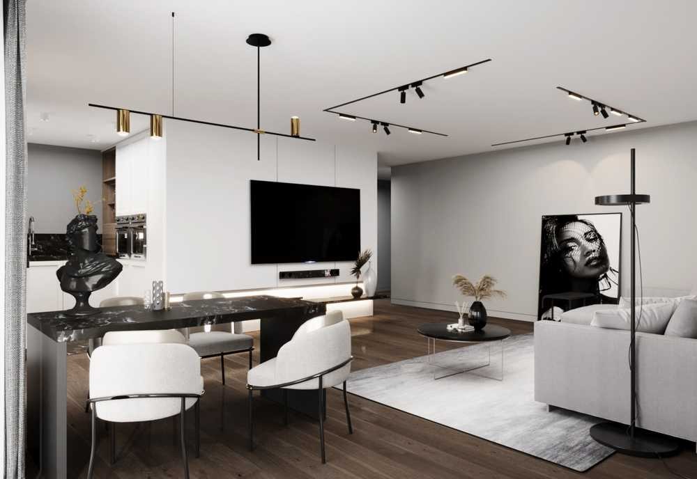 Der offen gestaltete Wohn- und Essbereich mit integrierter Küche ist das zentrale Element der Wohnung und bietet direkten Zugang zur großzügigen, überdachten Loggia mit Süd-Ausrichtung – ideal für entspannte Stunden im Freien.