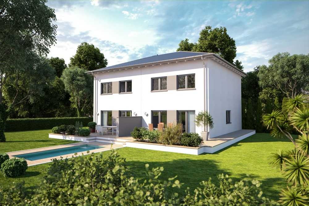 Die Hausplanung ist individuell veränderbar. Das Hausbeispiel zeigt ein Zweifamilien-Doppelhaus mit Walmdach.