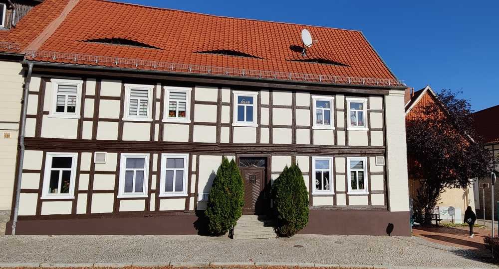 Dieses Fachwerkhaus (Zweifamilienhaus) stammt etwa aus dem Jahr 1850 und diente ursprünglich als traditionsreicher Gasthof „Ratskeller“ in bester Lage. Seit der Betriebsaufgabe im Jahr 2010 durch den damaligen Pächter wurde das Gebäude in ein Zweifamilienhaus umgewandelt, wobei insbesondere das Erdgeschoss in eine bedarfsgerechte Wohneinheit umgebaut wurde. Das Haus umfasst nun zwei vermietete Wohnungen, die eine angenehme Wohnmöglichkeit bieten. Die baulichen Erneuerungen umfassen eine Dacheindeckung aus dem Jahr 2003 und hochwertige ISO-Holzfenster von 2015. Beide Wohnungen verfügen über jeweils eine zentrale Gasheizung, die gleichzeitig das Warmwasser bereitstellt.