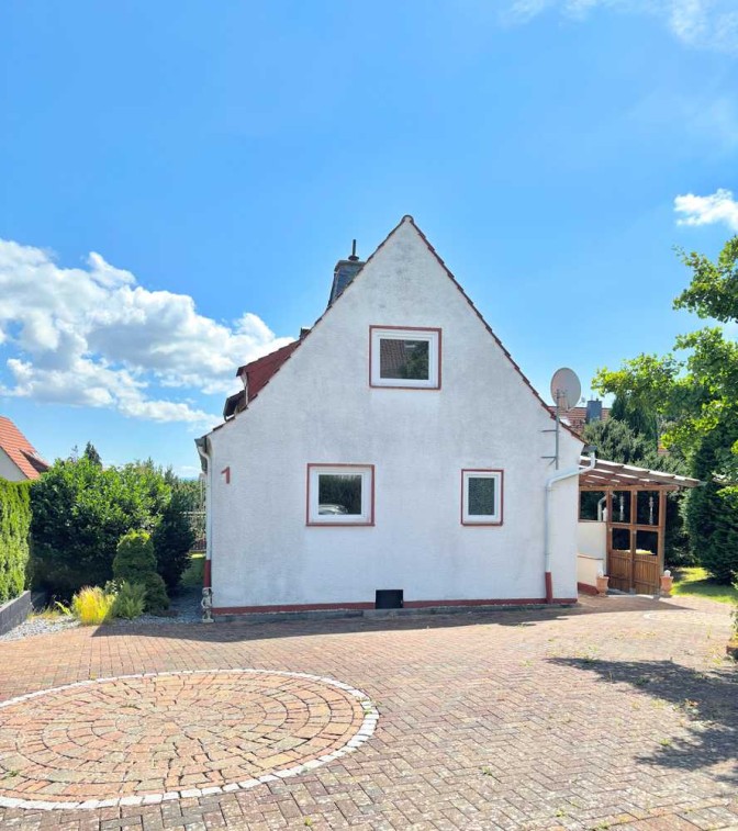 Das sonnige Grundstück bietet viel Platz zum Verweilen, Gärtnern oder für einen möglichen Anbau – die Gegebenheiten lassen hier viel Spielraum für Erweiterungen oder kreative Ideen. Vor dem Haus lädt eine überdachte Veranda zum Entspannen ein.