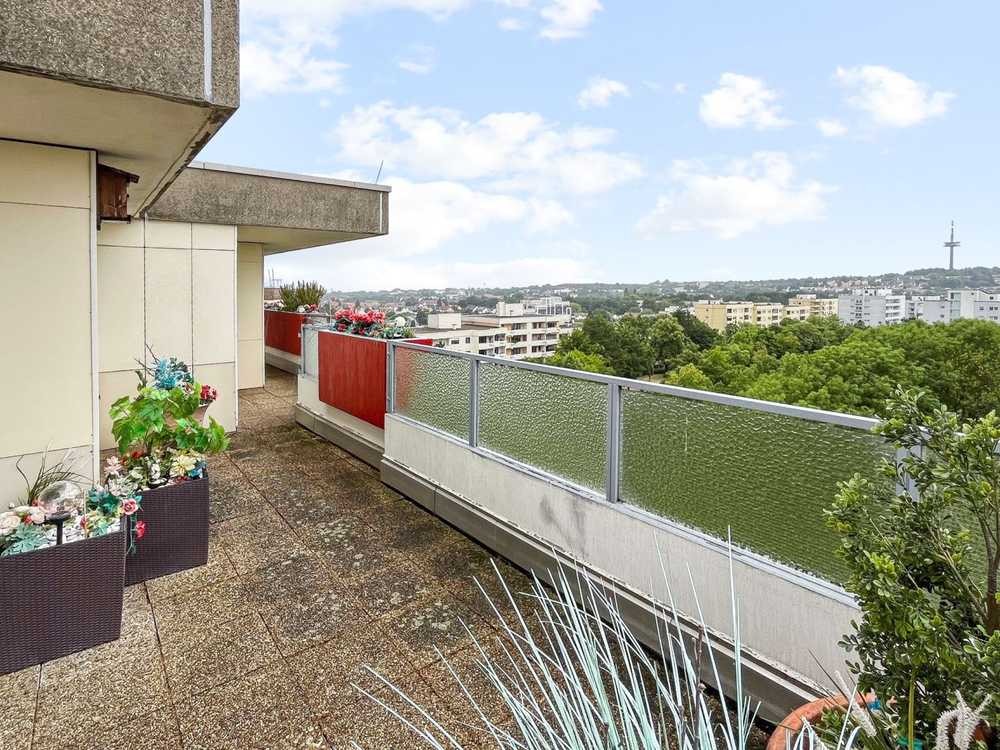 Hauptmerkmal der Wohnung im 8. Obergeschoss der ca. 1973 errichteten Wohnanlage ist die im Süden über die gesamte Breite der Wohnung laufende Dachterrasse mit ca. 35 m². Von hier aus bietet sich nach drei Seiten ein atemberaubender Ausblick auf die umliegenden Stadtteile bis hin zum Fernsehturm. Somit hat man hier Sonne den ganzen Tag. Die Dachterrasse kann über drei separate Türen vom Wohnzimmer, vom Esszimmer sowie vom hinteren Teil des Flurs aus betreten werden. Alle Terrassentüren sind mit Fliegengitter versehen.