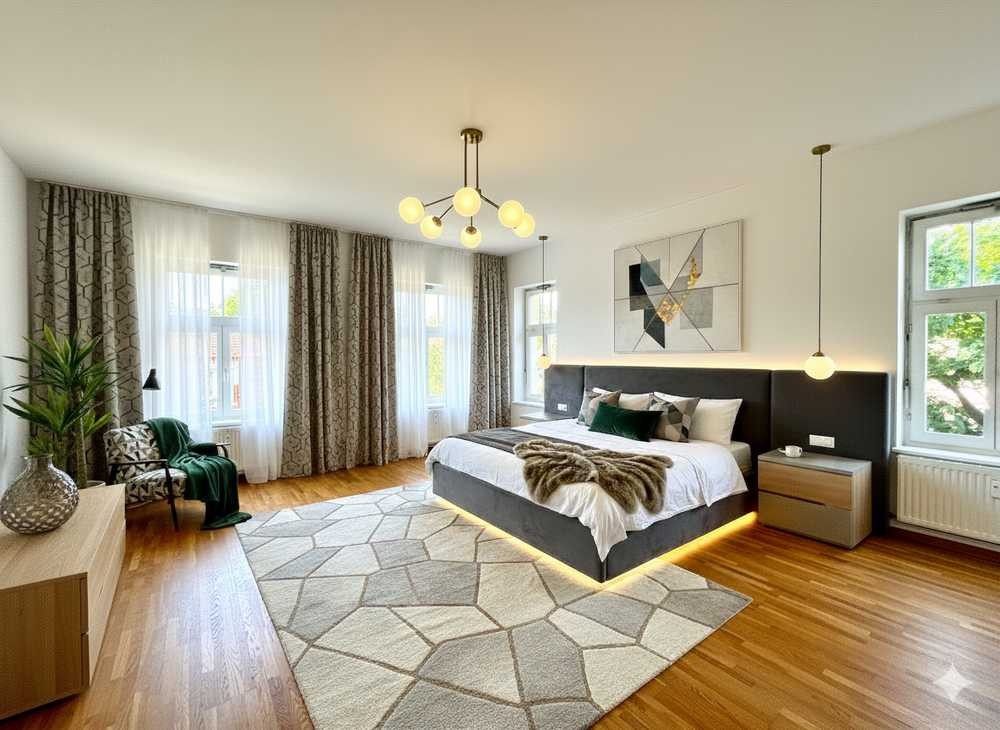 Diese besondere Eigentumswohnung im 1. OG eines Altbaus von 1907 bietet auf großzügigen 155,88 m² ein wunderschönes Wohnambiente. Mit insgesamt 5 Zimmern, inklusive drei potenziellen Schlafzimmern, präsentiert sich die Wohnung mit einem gut geschnittenen Grundriss. Ein langer Flur führt elegant durch die Räumlichkeiten und schafft eine großzügige Atmosphäre. Die vorderen beiden Zimmer eignen sich ideal als Wohn- und Esszimmer und sind durch altbautypische Flügeltüren verbunden. Mit Doppelkastenfenstern und kunstvollen Stuckdecken strahlen sie den Charme vergangener Epochen aus. Eine Loggia mit Südausrichtung und grünem Ausblick lädt zu entspannten Stunden im Freien ein. Zwei weitere Zimmer, perfekt als Kinder-, Gäste- oder Arbeitszimmer geeignet, sowie ein Badezimmer mit Dusche und Wanne, erreichen Sie ebenfalls vom Flur aus. Die offene Wohnküche im hinteren Bereich ist mit einer praktischen Abstellkammer ausgestattet. Ein besonderes Highlight ist das geräumige Hauptschlafzimmer mit fast 33 m², das einen Rückzugsort der Extraklasse bietet.