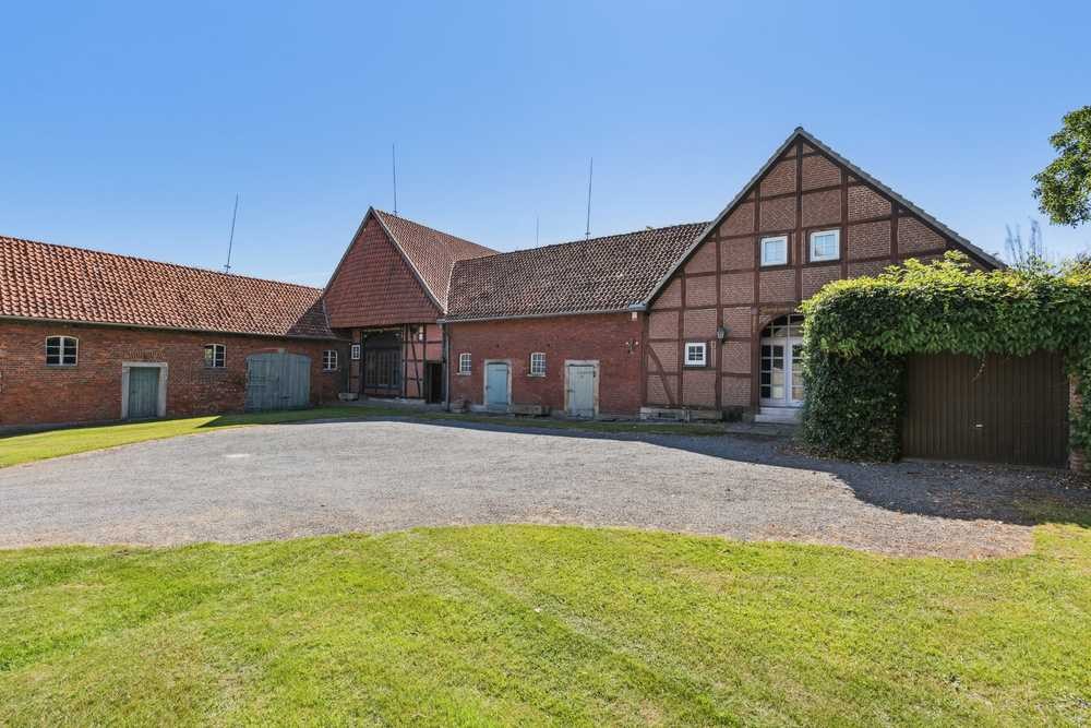 Zwischen sanften Hügeln, weiten Feldern und unter dem Schutz jahrhundertealter Eichen liegt dieser außergewöhnliche, denkmalgeschützte Resthof aus dem frühen 19. Jahrhundert – ein Ort voller Geschichte, Charakter und Möglichkeiten. Wer das Besondere sucht, findet hier nicht nur ein Zuhause, sondern ein echtes Refugium: Mit einem rund 20.000 m² großen Grundstück, zwei charmanten Wohnhäusern, Stallungen, Scheune, Backhaus und Garage ist dieses Anwesen wie geschaffen für Menschen mit Vision, Sinn für Ursprünglichkeit und Liebe zur Natur. Schon die Einfahrt über die malerische Kieselsteinauffahrt, eingerahmt von alten Bäumen, stimmt auf das ein, was Sie erwartet: Ruhe, Weite und eine Atmosphäre, die tief durchatmen lässt. Die zwei nebeneinanderliegenden Fachwerkhäuser erzählen Geschichten aus zwei Jahrhunderten und wurden mit Sorgfalt und Liebe zum Detail bewahrt und teilweise aufwändig modernisiert. Im ersten Wohnhaus wurde der komplette Erdgeschossbereich hochwertig kernsaniert. Hier empfängt Sie ein stilvoller Mix aus historischem Charme und moderner Ausstattung: Edle Natursteinfliesen, Fußbodenheizung, eine neue Einbauküche mit Markengeräten, ein helles Wohnzimmer mit Zugang in den Garten, zwei weitere Zimmer sowie ein geschmackvoll renoviertes Badezimmer mit Regendusche schaffen ein Ambiente zum Wohlfühlen. Das Obergeschoss bietet mit fünf Zimmern und einem zusätzlichen Bad viel Platz für Familie, Gäste oder Büro. Ein Durchgang durch den ehemaligen Pferdestall – oder alternativ der separate Eingang – führt Sie in das zweite Haus mit seiner charaktervollen Tenne als Herzstück. Hier wurden ebenfalls drei Zimmer renoviert, eine neue Küche eingebaut und ein angrenzender Abstellraum ergänzt. Besonders charmant: das sogenannte Bürgermeisterzimmer, das an die Geschichte des Hauses erinnert. Im Obergeschoss stehen drei weitere Räume zur Verfügung – ideal für weitere Wohnnutzung oder kreative Ideen. Ergänzt wird das Ensemble durch einen Pferdestall, einen Kuhstall, eine große Scheune, ein historisches Backhaus sowie eine Garage. Ob für Tierhaltung, Gartenbau, handwerkliche Projekte oder kreative Arbeiten - hier finden Sie vielseitige Nutzungsmöglichkeiten und großzügigen Freiraum: Dieses Anwesen bietet Raum für Ihre Träume. Hier vereinen sich Natur, Geschichte und Geborgenheit zu einem Lebensort, wie man ihn nur selten findet.