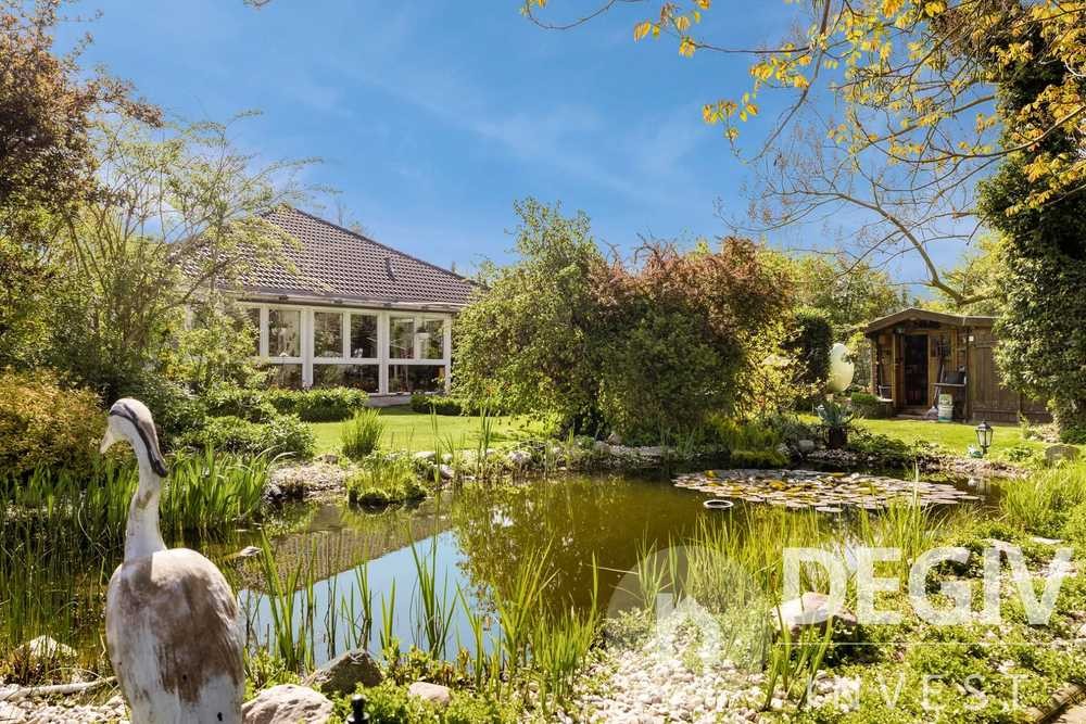 Der einladende Wintergarten bildet eine harmonische Verbindung zwischen drinnen und draußen und bietet einen malerischen Blick auf das umliegende, ruhige Teichgrundstück. Eine clevere Raumaufteilung sorgt dafür, dass neben dem Hauptwohnbereich auch eine separate Einheit – ideal als zusätzliche Wohnung oder als Büro/Atelier – zur Verfügung steht. Diese vielseitige Nutzungsmöglichkeit lässt sich je nach Bedarf flexibel anpassen.