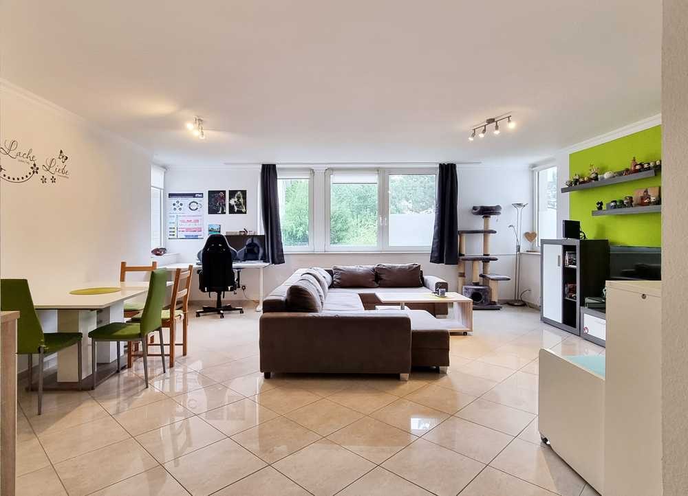 Beim Betreten der Wohnung befindet sich linker Hand der offen gestaltete und großzügige Wohnbereich. Hier finden sowohl ein großes Sofa als auch ein Esstisch bequem Platz, sodass Sie gemütliche Abende mit Familie und Freunden genießen können. Große Fenster lassen den Raum mit viel Tageslicht durchfluten und sorgen für eine helle, einladende Atmosphäre.
