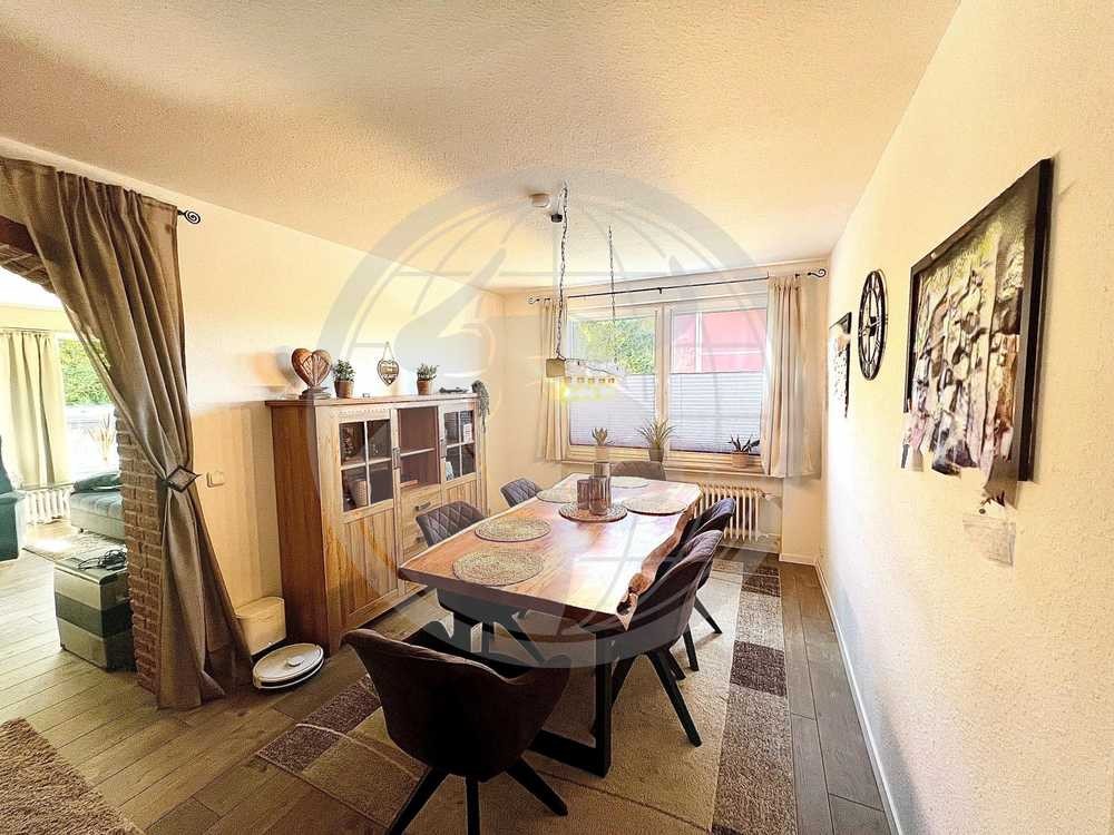 Herzstück des Hauses ist das angrenzende Esszimmer mit offenem Durchgang zum Wohnzimmer. Hier verbindet sich Funktionalität mit Gemütlichkeit. Der stilvolle Kamin schafft eine warme Atmosphäre und macht den Raum zu einem Ort des Zusammenkommens – sei es mit Familie oder Freunden. Große Fensterflächen durchfluten den Wohnbereich mit Tageslicht und bieten einen wunderbaren Blick nach draußen. Von hier gelangen Sie auf die Terrasse, die mit ihrer sonnigen Ausrichtung und dem direkten Zugang in den Garten zu entspannten Stunden im Freien einlädt. Der frisch eingesäte Rasen bietet eine perfekte Grundlage für grüne Gestaltungsideen oder Spielflächen für Kinder.