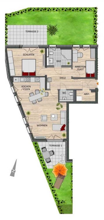 Je nach Lage im Gebäude profitieren die Wohnungen von einem Balkon, einer Loggia oder einer Terrasse mit eigenem Gartenanteil. Einige Einheiten verfügen zusätzlich über separate Abstellräume mit Anschlussmöglichkeiten für Waschmaschine und Trockner – ein praktischer Pluspunkt für den Alltag.