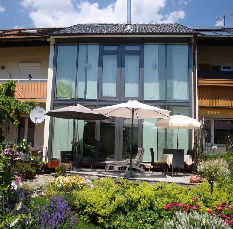 Ein echtes Highlight ist die raumhohe Pfosten-Riegel-Fassade auf der Südseite. Sie sorgt nicht nur für großzügige Lichtverhältnisse und solare Wärmegewinne, sondern ermöglichte auch die Erweiterung des Wohnraums durch die Integration der ehemals offenen Balkone - sowohl im Erdgeschoss als auch im Obergeschoss.