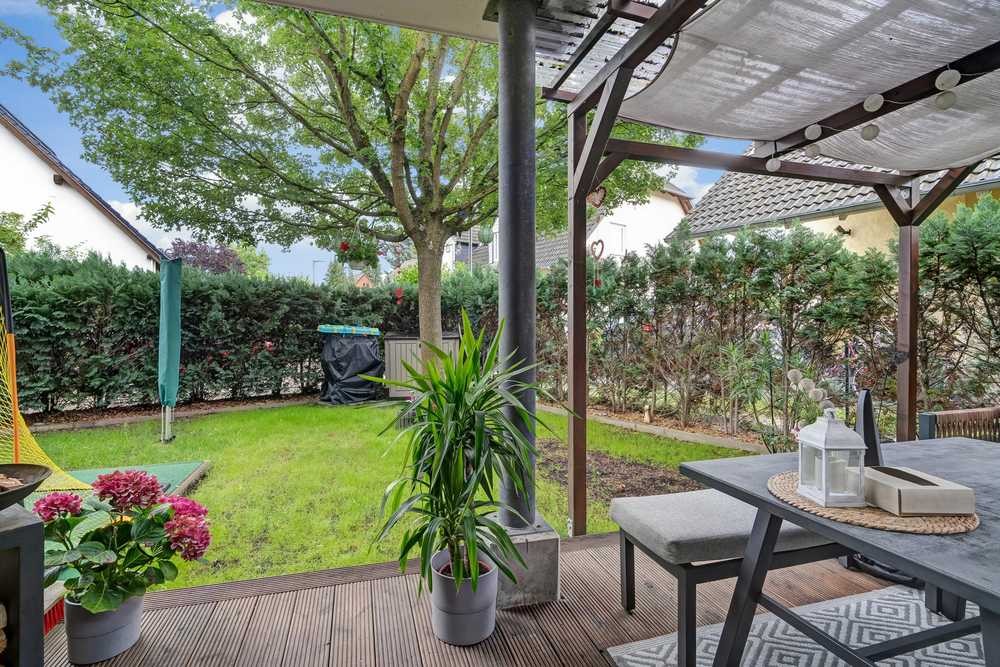 Die Terrasse lädt mit ausreichend Platz für Sitzmöbel und Pflanzen zum Verweilen ein. Eine Pergola spendet angenehmen Schatten und schafft einen geschützten, gemütlichen Bereich für entspannte Stunden im Freien. Der anschließende Garten ist bepflanzt und gepflegt, bietet aber auch Raum zur eigenen Gestaltung – sei es als Ziergarten, Nutzgarten oder Spielfläche für Kinder. Hier können Sie dem Alltag entfliehen und die Natur genießen, ohne die Stadt verlassen zu müssen.