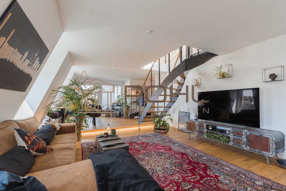 Schon beim Eintreten vermittelt die Wohnung ihren einzigartigen Charme: Edler Parkettboden, eine offene Wohnküche mit hochwertiger Einbauküche sowie eine markante Metall-Holz-Treppe verleihen dem Interieur einen zeitgemäßen Look mit leichtem Loft-Charakter. Der lichtdurchflutete Wohn- und Essbereich fungiert als kommunikatives Herzstück – ideal für entspannte Abende oder gesellige Runden.
