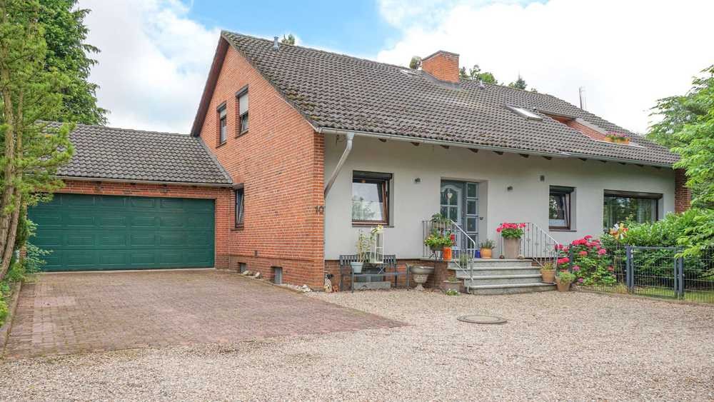 Bei dieser Immobilie handelt es sich um ein großes ansprechendes Einfamilienhaus mit (Satteldach mit Pfanneneindeckung, Verblendmauerwerk u. Wärmedämmverbundsystem) möglicher Einliegerwohnung im Obergeschoss, großer Wintergarten mit Elektrokamin, Dachbalkon, Südterrasse überdacht, Westterrasse mit Außenkamin, große Doppelgarage ( ca. 30 m², Massivbauweise mit Automatiktor und Grube) mit zusätzlichem Abstellraum (ca. 8 m²), begehbar aus der Garage oder von der Südterrasse. Die Garage hat ein Satteldach mit Pfanneneindeckung. Ferner befindet sich im Bereich der Zufahrt auf das Grundstück ein Holzgartenhaus mit offenem Unterstand. Auf dem Grundstück sind mehrere Obstbäume (essbare Früchte) vorhanden.