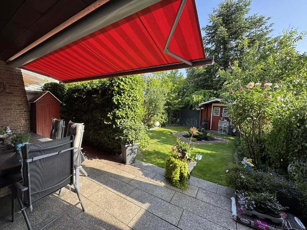 Vom Wohnzimmer aus gelangen Sie auf die teilweise überdachte, ca. 24 m² große Terrasse. Genießen Sie die Ruhe und den Blick in den schönen, uneinsehbaren Garten. Ein Gartenhäuschen sorgt für Stauraum.
