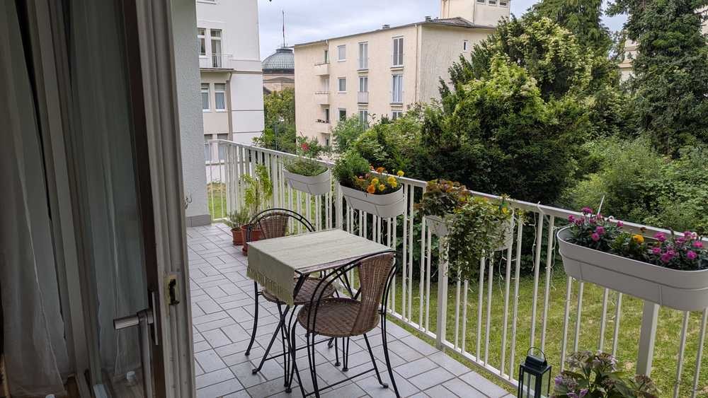 Die Wohnung zeichnet sich durch eine gute Raumaufteilung und die relativ große Loggia mit Blick zum Garten und zum Kurhaus Glaskuppeldach.