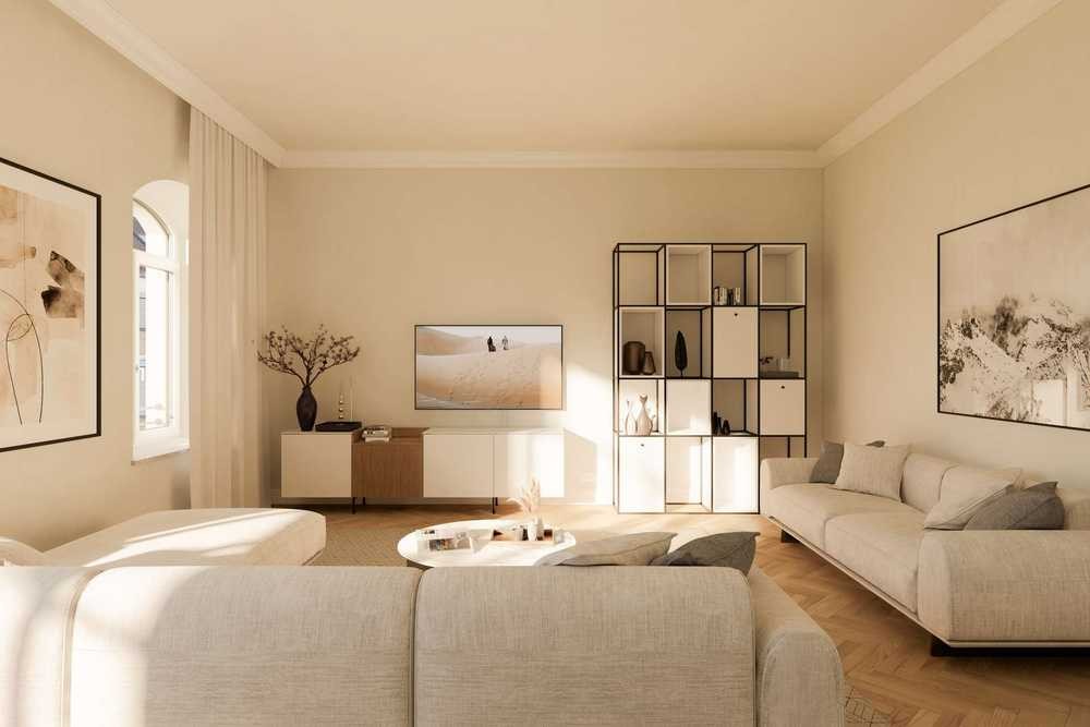 Nach klassischem Altbau-Grundriss ordnen sich die Räume um eine zentrale Diele an, was ein großzügiges Ambiente vermittelt. Ein ausgezeichnet geschnittener Wohn-/Essbereich vereint diese Funktionen auf harmonische Weise und bietet außerdem Platz für eine offene Küche.