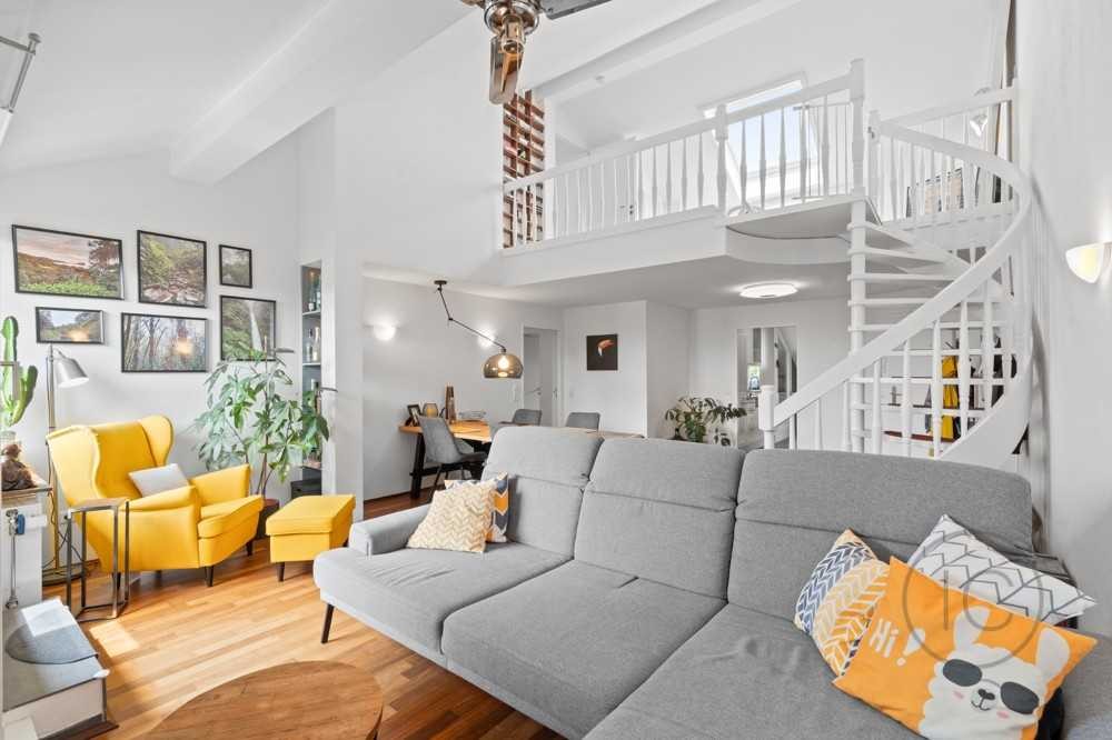 Ein architektonisches Highlight der Wohnung ist die elegante Wendeltreppe, die das Wohnambiente stilvoll prägt. Sie führt in die obere Etage, die sich als großzügiger Rückzugsort eignet – ob als Hauptschlafzimmer, Atelier, Homeoffice oder Gästebereich. Ein vorgelagerter Vorraum schafft zusätzlich Privatsphäre und Flexibilität in der Nutzung.