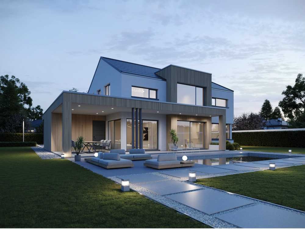 Dieses schlüsselfertige Einfamilienhaus überzeugt mit seinem modernen "Modern Vision"-Architekturstil und einem durchdachten Raumkonzept. Die großzügigen Glasflächen in Wohn-, Ess- und Kochbereich sorgen für eine helle und offene Atmosphäre. Zwei große Hebeschiebetüren führen auf die Terrasse und lassen den Wohnbereich mit dem Außenraum verschmelzen. Eine elegante, in der Wand geschobene Doppeltür trennt Diele und Wohnbereich und unterstreicht das offene, moderne Design.